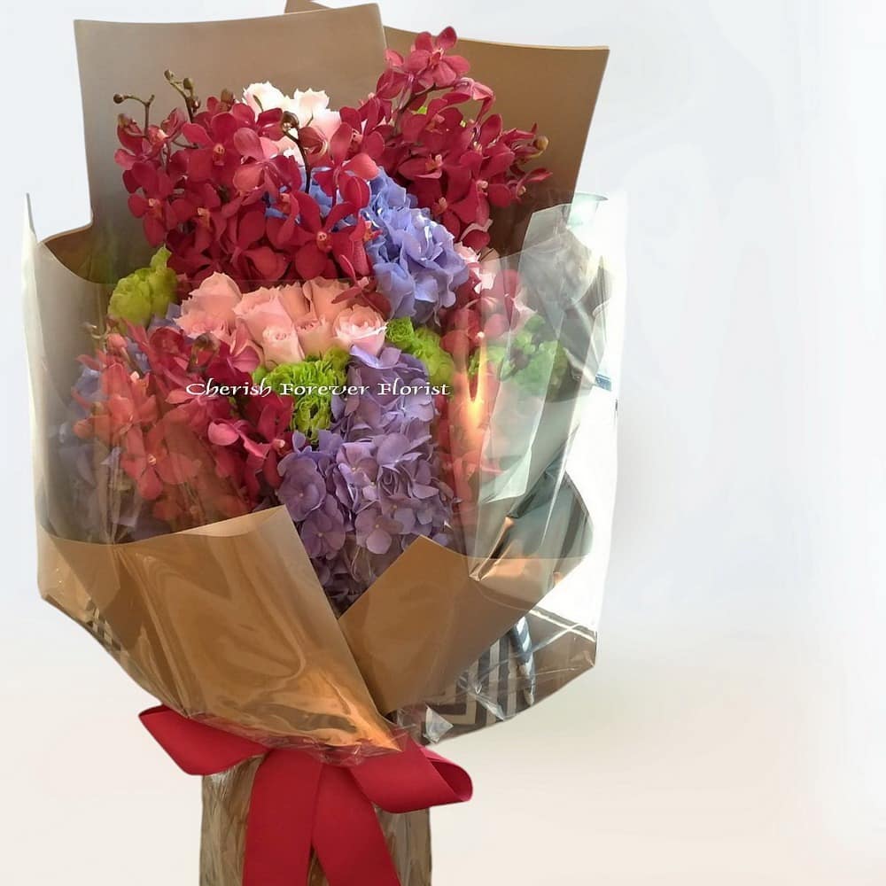 Bouquet Recipe : Thai Orchid, pink rose, violet blue hydrangea, green eustoma, seasonal blooms