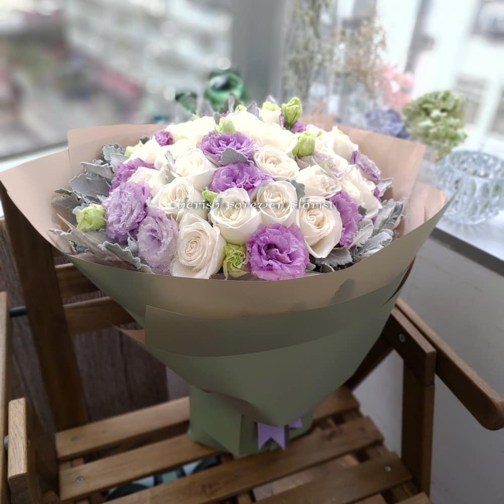 Bouquet Recipe: 30 pcs creamy white roses, light purple eustoma, foliage, seasonal blooms