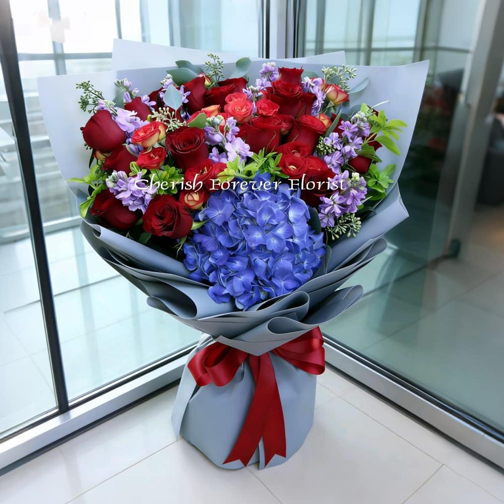 Bouquet Recipe : Blue hydranges and red roses bouquet, foliage and seasonal blooms