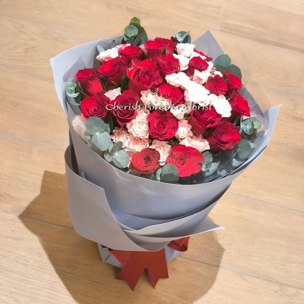 Bouquet Recipe : Red roses and mini pink roses, foliage and seasonal blooms