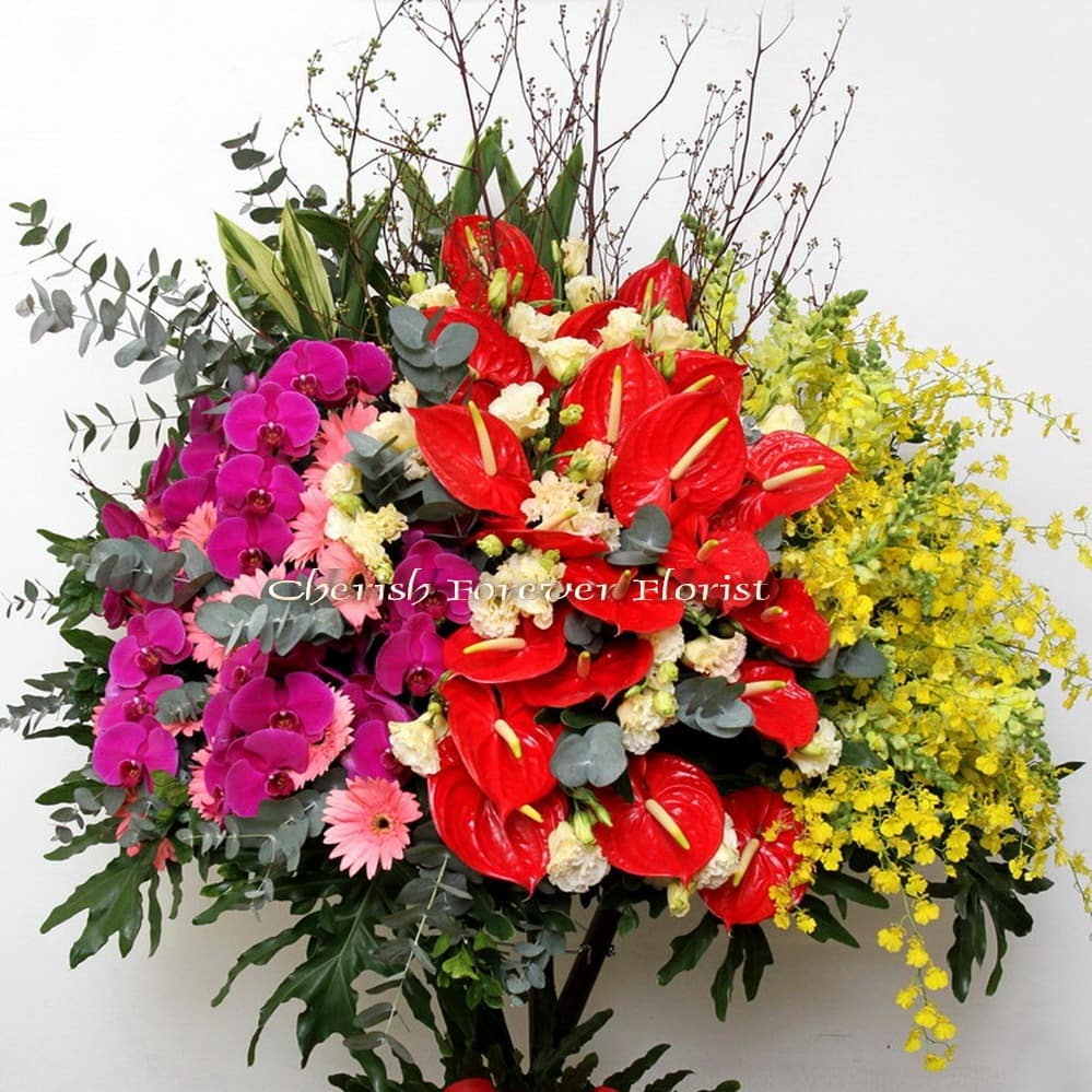 Flower Recipe: Dancing lady, red auturium, butterfly orchid, pink gerbera, eustoma, foliage, seasonal blooms