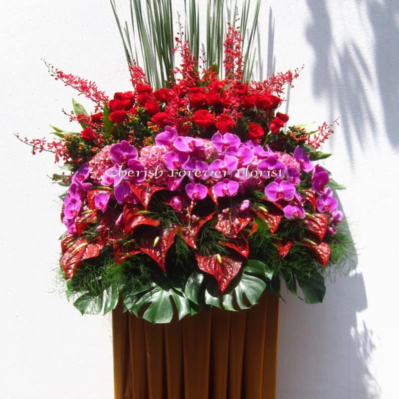 Flower Recipe: Red auturium, red rose, red Thai orchid, butterfly orchid, pink hydrangeas, foliage, seasonal blooms