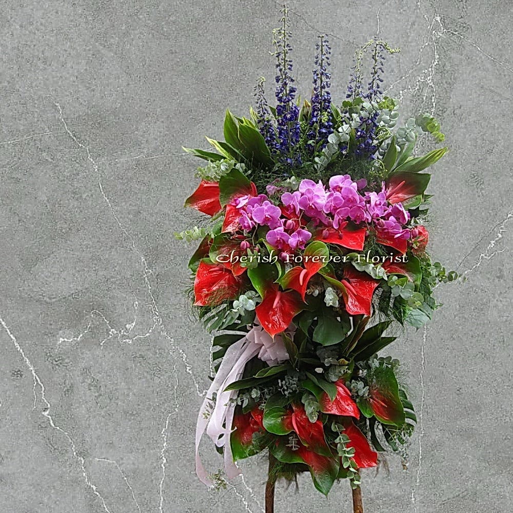 Flower Recipe: Butterfly orchid, red auturium, delphinium, foliage, seasonal blooms