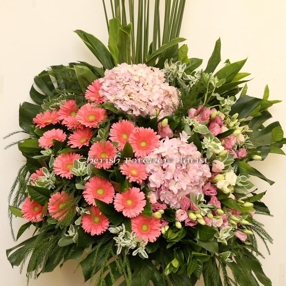 Flower Recipe : Pink hydrangea, pink gergera, purple rose, pink eustoma; seasonal blooms.