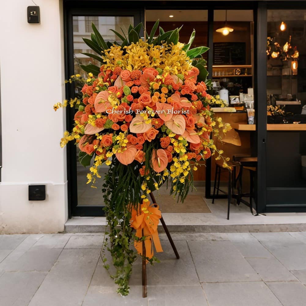 Flower Recipe : Yellow Thai Orchid, orange roses, pink auturium, dancing lady, eustoma, seasonal blooms.