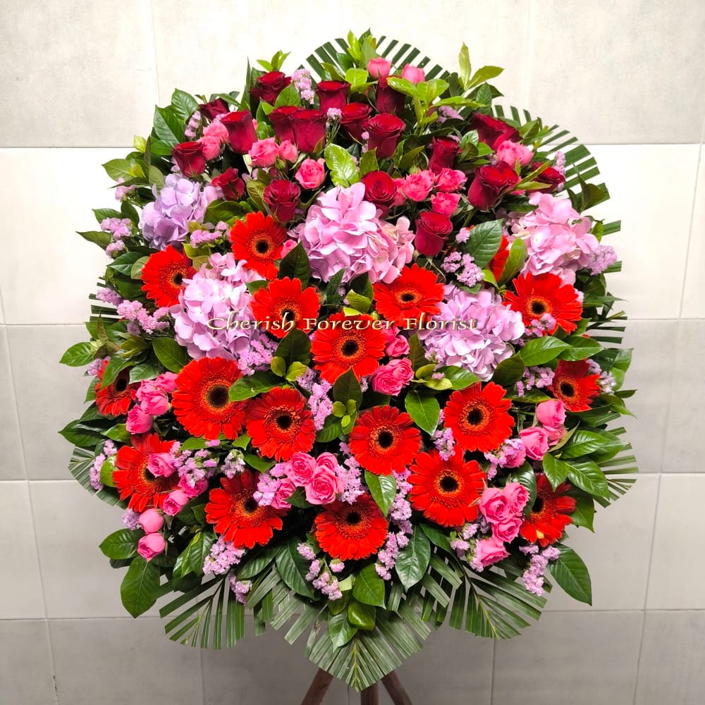 Flower Recipe: Red roses & mini pink roses, pink hydrangea, red gerbera, foliage, seasonal blooms.