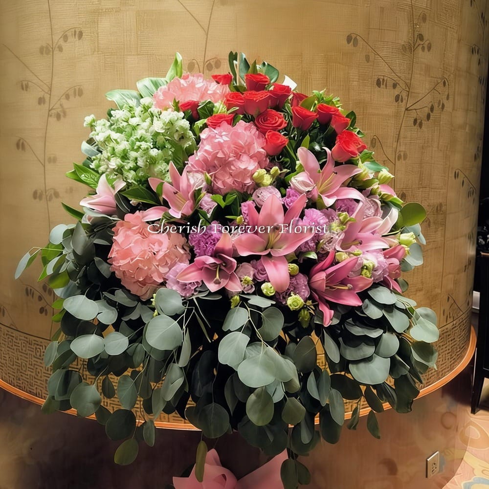 Flower Recipe: Pink lily, pink hydrangea, red rose, white musk, light purple eustoma, foliage, seasonal blooms
