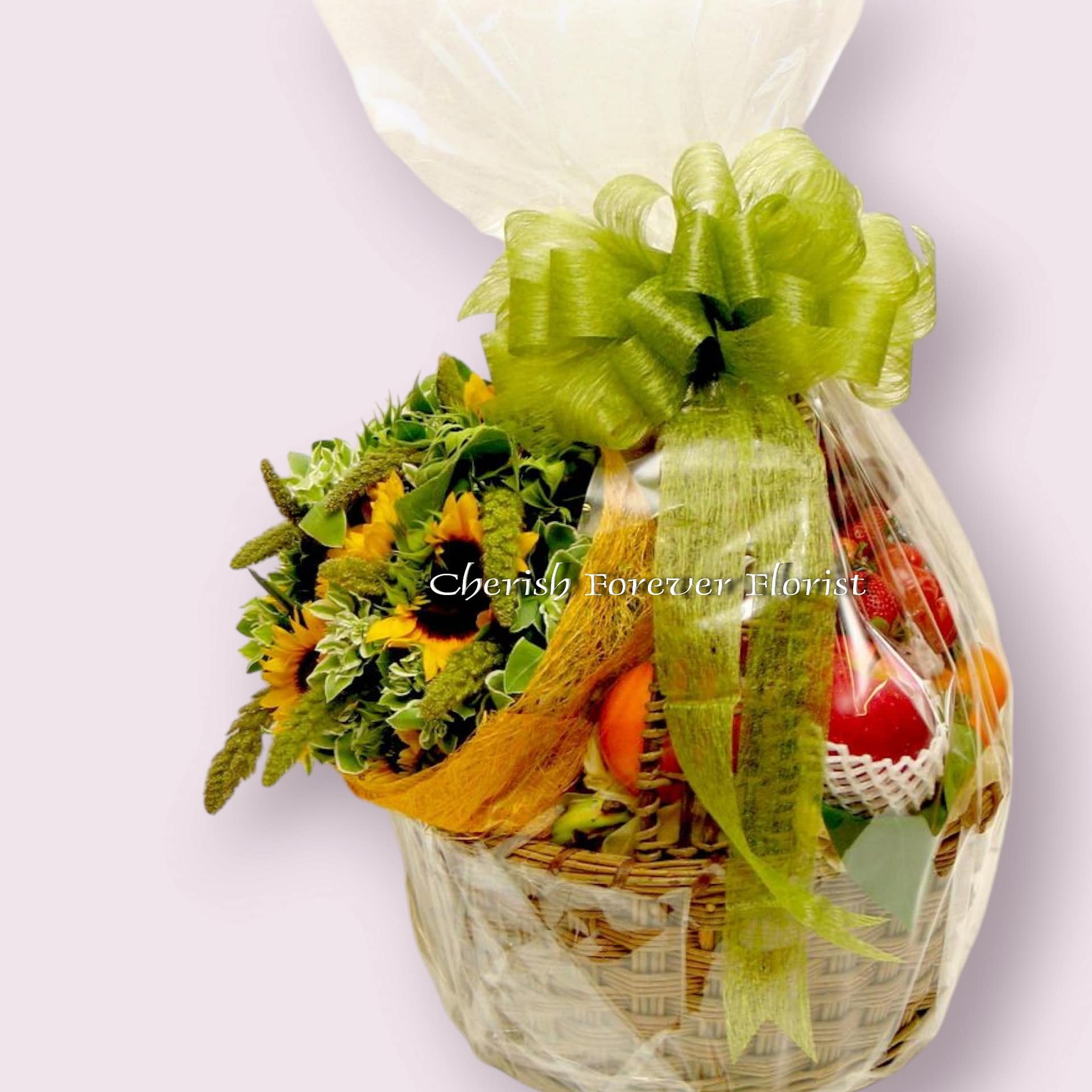 • Approx 8 species seasonal fruits • Seasonal bloom flower Arrangement • Traditional gift basket or faux leather box • Complimentary message card