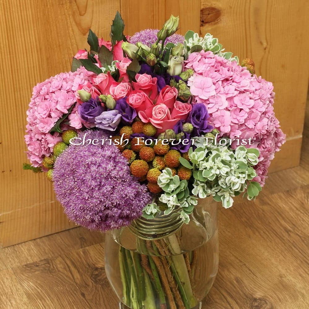 Flower Recipe: Glass vase filled with purple rose, pink hydrangea, purple sensation/purple hydrange, purple eustoma, bruniaberry, seasonal blooms