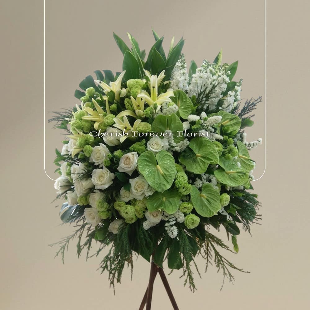 Flower Recipe : White lily, white musk, white rose, green anthurium, green eustoma, seasonal blooms