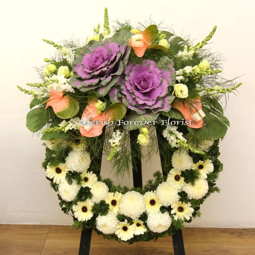 Flower Recipe : Anthurium, purple kale, white chrysanthemum, white gerbera, dog flower, seasonal blooms