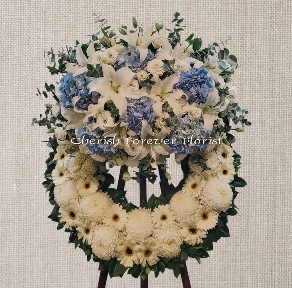 Flower Recipe: White lily, blue hydrangea, white gerbera, white chrysanthemum, seasonal blooms